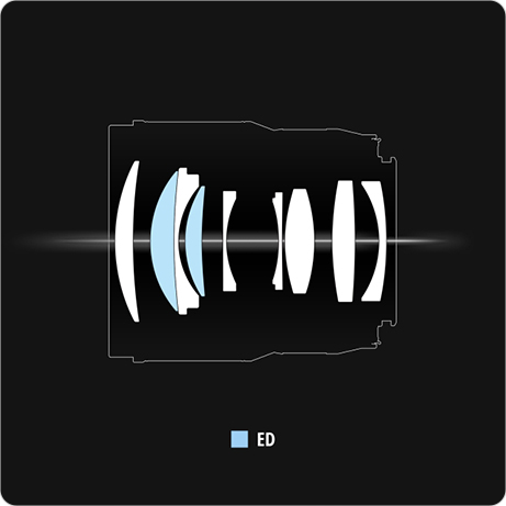 The optimized configuration has 9 elements in 8 groups, including 2 ED lenses to minimize aberrations and ensure superb resolution.