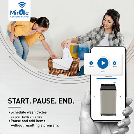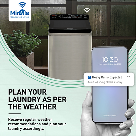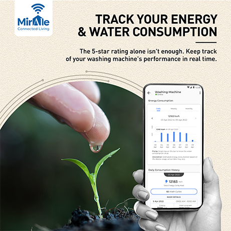 Conveniently track and tap the power and water consumption of your washing machine through the MirAie app.