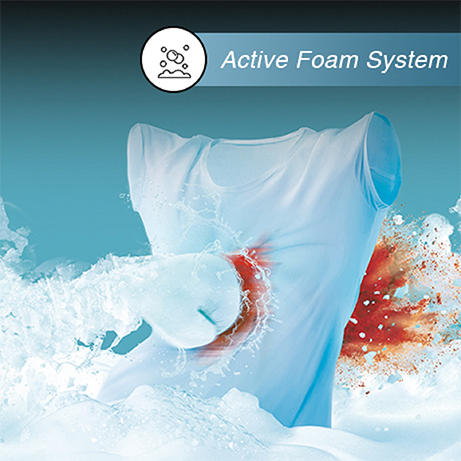 The Active Foam System creates fine, high-density foam before the washing cycle starts. The foam lifts, separates and removes dirt particles from deep within the fibers. Clothes get soaked along with the detergent. Foam sticks to the stains and soaks the dirt particles. Dirt is pulled out of the fine fibers and is washed away with the powerful flow of the water.
