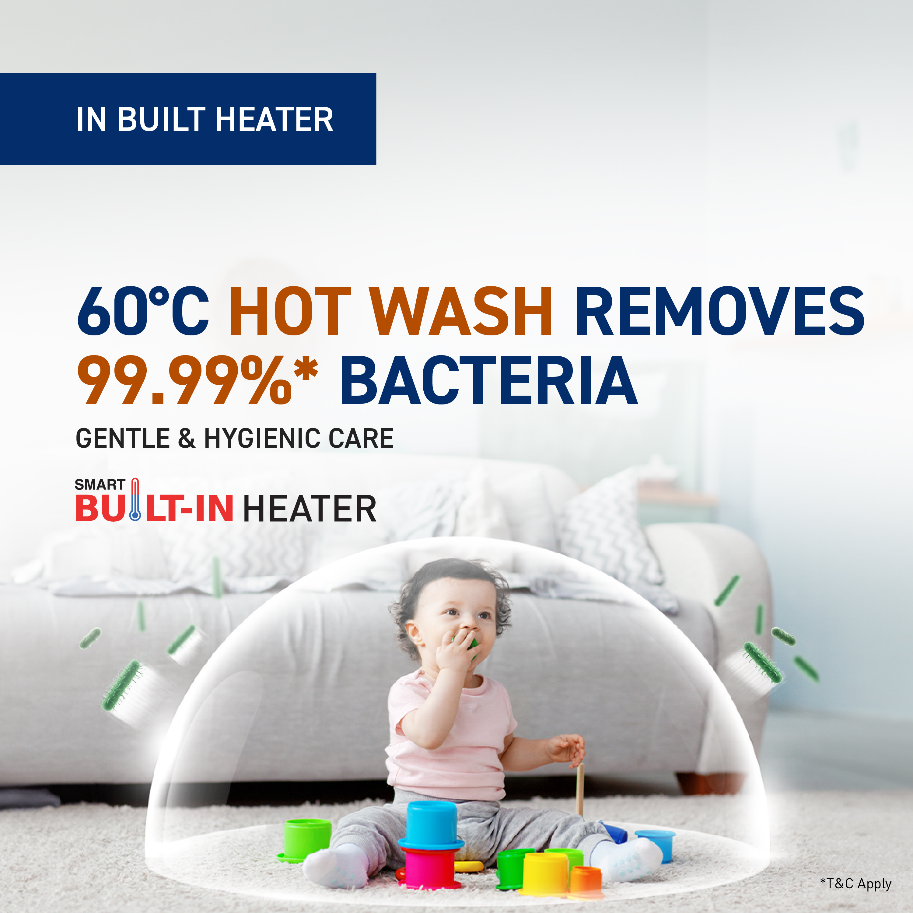 Smart Built-in Heater removes up to 99.99% bacteria